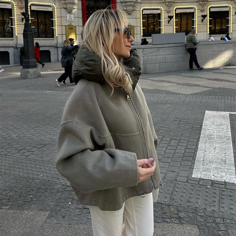 Women's Casual Hooded Drawstring Long Sleeved Jacket Autumn Winter Fashion Zipper Panelled Coat Short Loose High Street Outwear