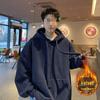 Experience comfort and style with this men's fleece-lined hooded sweatshirt, perfect for both spring and autumn seasons. Featuring a stand neckline and long sleeves, this jacket offers a trendy loose fit that keeps you warm and cozy. Made from high-quality polyester material with a solid pattern, the interior boasts a plush polyester fiber lining, ideal for those who love a blend of retro and vintage vibes. Whether you're heading out for a casual day or layering for outdoor activities, this hoodie serves as a versatile addition to your wardrobe.