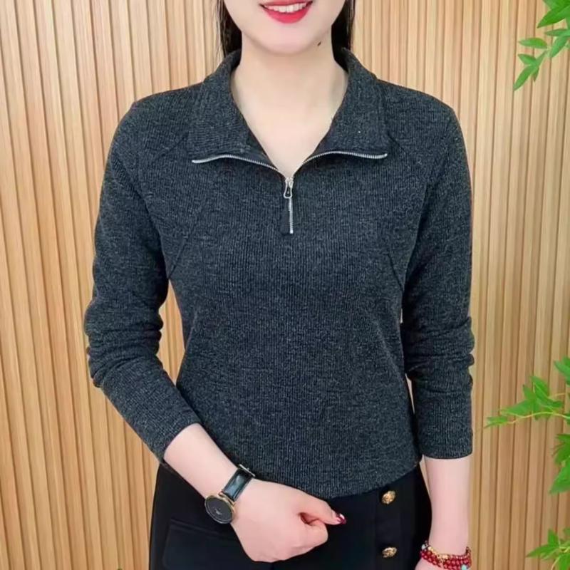 2025 Autumn New Fashionable Solid Color Middle-aged Mother Base Shirt Half Zipper Long Sleeve T-shirt Women's Top