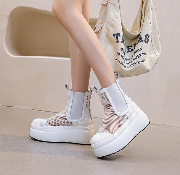 High Quality 8CM Air Mesh Microfiber Leather Ankle Boots Sandals Women Chunky Sneaker Platform Wedge Summer Comfy Shoes Hollow