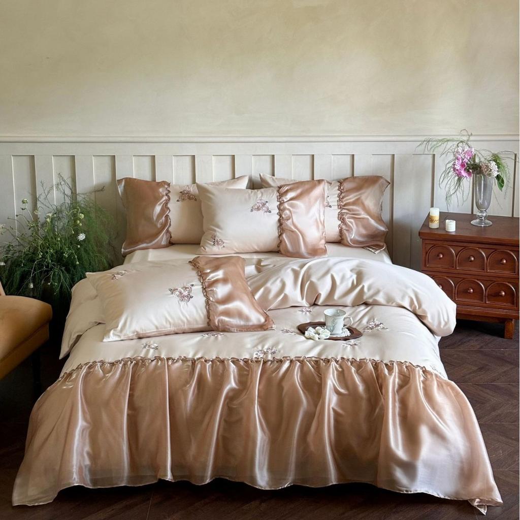Four-piece Set of Pure Cotton Bedding, French Rose Embroidered Lace, Skin-friendly and Breathable Quilt Cover, Bed Sheet Pillowcase Set.