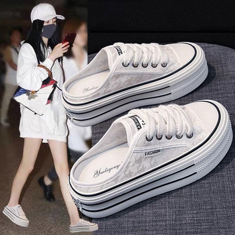 Thick-soled Lace Canvas Slippers for Women To Wear In the Autumn of 2025, the New Models Are One-pedal Lazy Bag Head and Half-drag White Shoes.