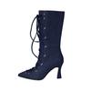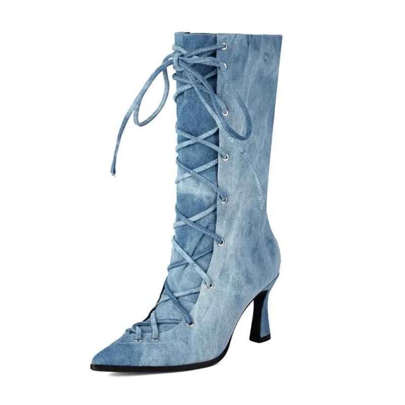 Fashion New Blue Denim Cross Strap Mid-calf Boots Autumn Winter Fashion Black 8cm High Heel Plush Warm Women's Long Boots Size 34-48