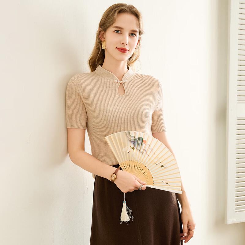 TUHUANG New Chinese Style Beaded Qipao Collar Knit T-shirt