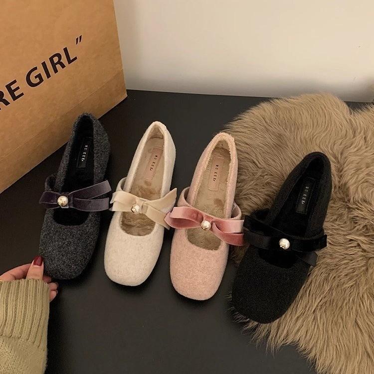 Inner Height Increase Pink Mary Jane Fluffy Shoes Women's Shoes 2025 Autumn and Winter Warm Cotton Shoes Bow Pearl Cotton Shoes