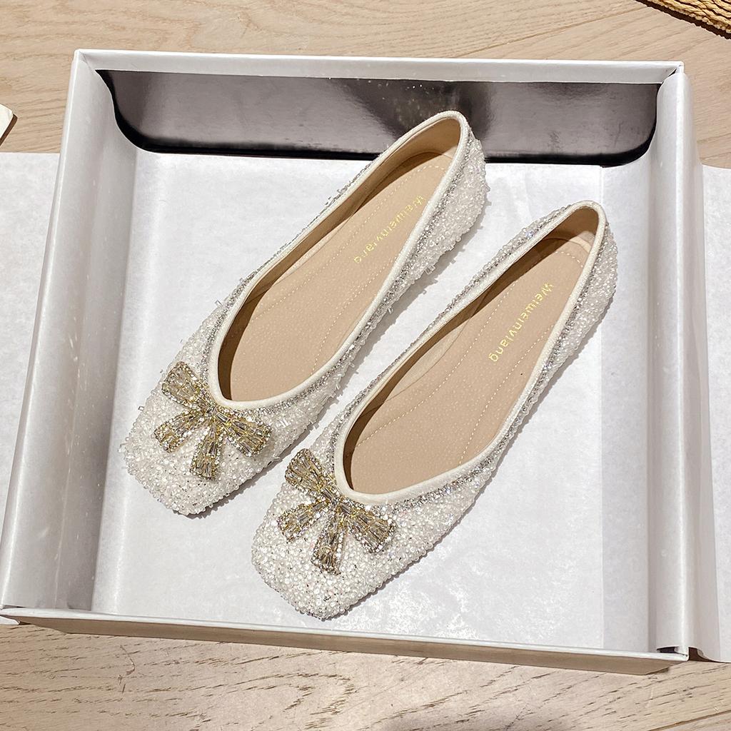 Weiwei Women's 5933-9 Square Head Single Shoes Women's Flat Bottom One-pedal Bow Rhinestone Beanie Shoes Spring Ladyshoes Women