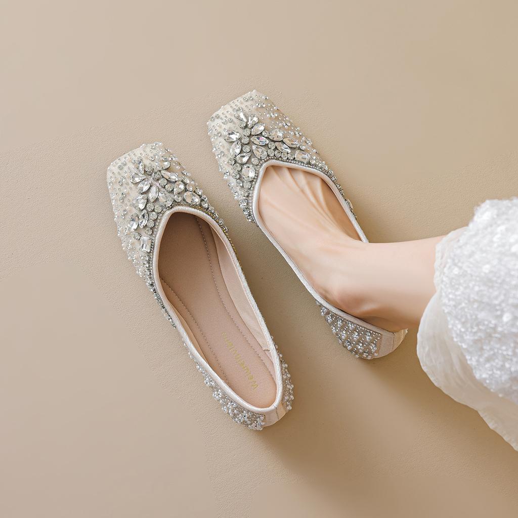 Weiwei Girl 5933-21 Square Head Flat-soled Single Shoes Women's Skirt Rhinestone Wedding Shoes Soft Soles Not Tired Feet Doudou Shoes