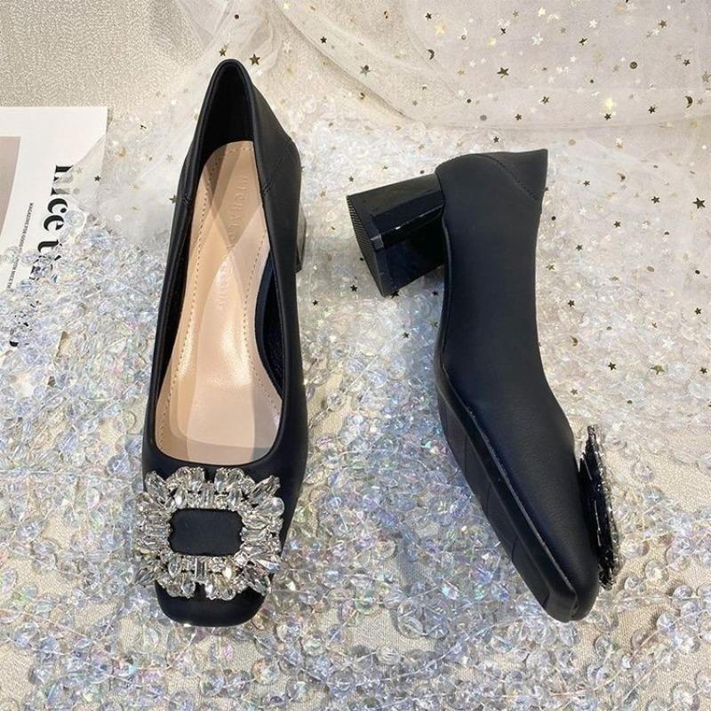 Autumn Rhinestone Square Head Thick Heel Single Shoes Women's New Fashionable Versatile Soft Leather Shallow Mouth Temperament Middle Heel Shoes