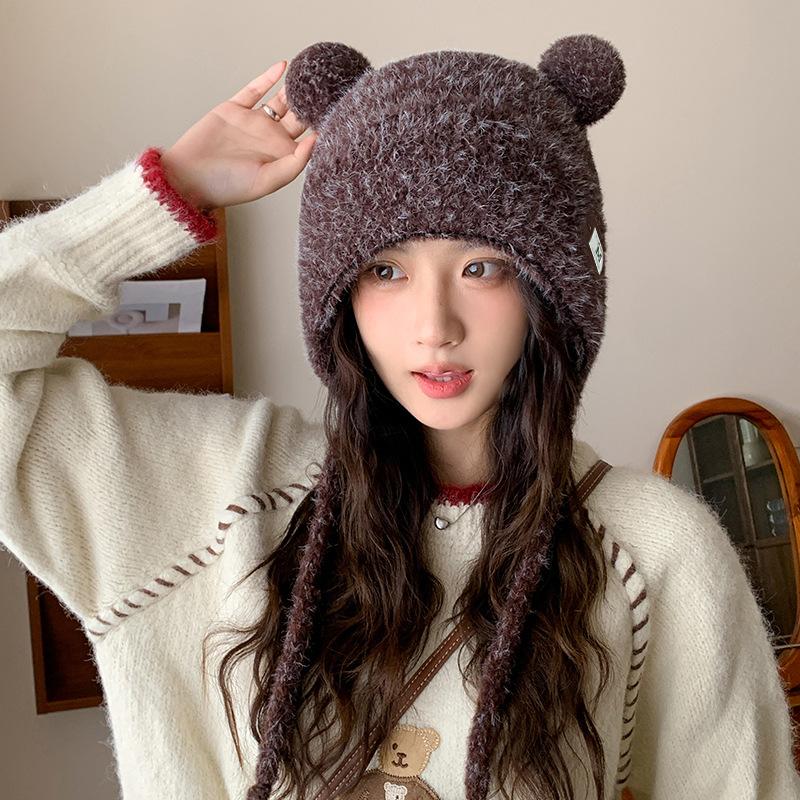 Autumn and Winter Warm and Cold Hat Big Head Circumference Showing Face Small Knitted Hat Cute Plush Bear Ears Warm Lei Feng Hat for Women