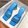 Fashion Eilyken Summer CRYSTAL Triangle Thick Heel Slippers Sexy Street Woman Square Toes Dress Party Shoes Size 35-41