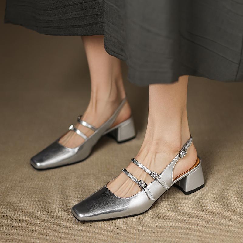 Fashion NEW Summer Women Sandals Genuine Leather Shoes Women Square Toe Chunky Heel Shoes Cover Toe Slingback Sandals Mary Janes Shoes