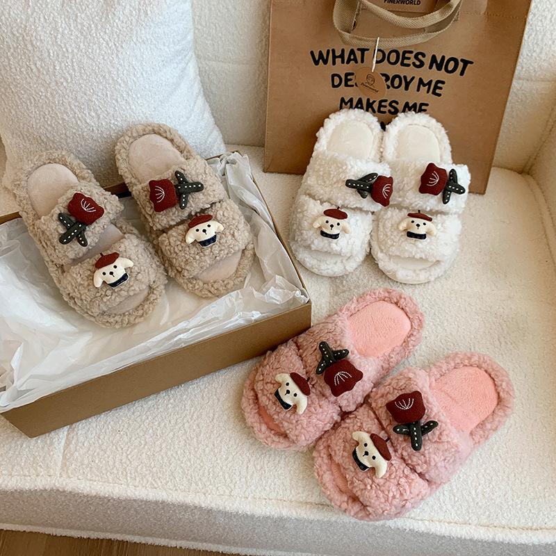 Cute Cartoon Puppy Fluffy Slippers Women's Winter 2025 New Versatile Thick Bottom Heightening Outer Wear Cotton Slippers Tide