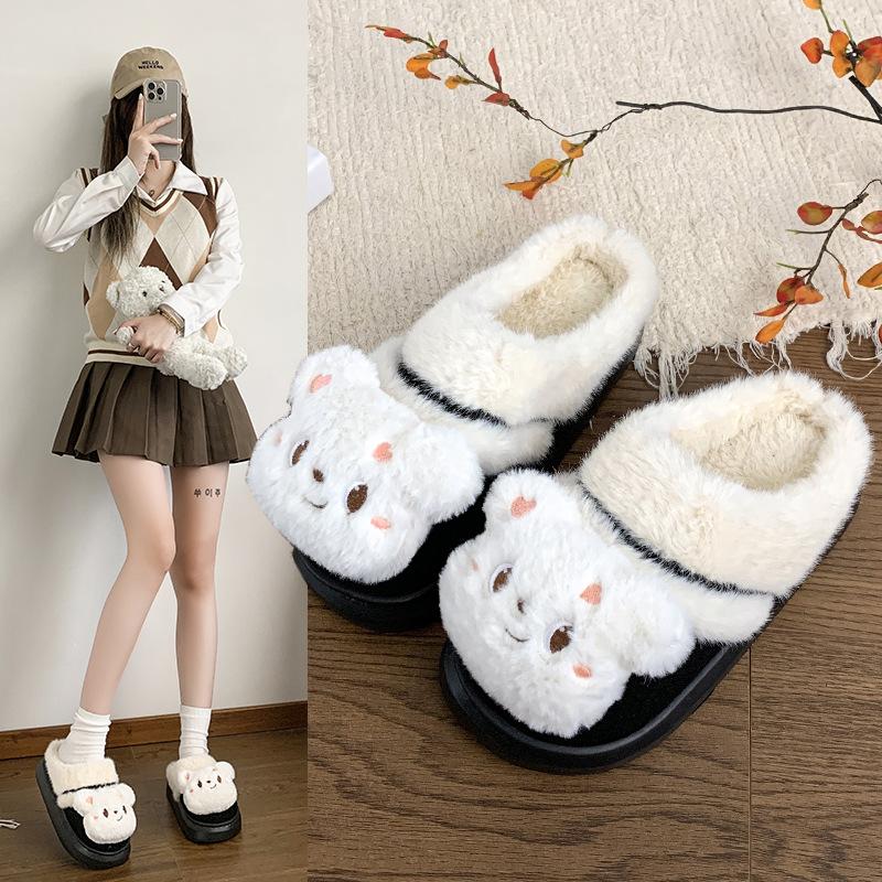 Cute Plush Bear Winter 2025 New Warm Indoor and Outdoor Wear Winter Thick Bottom Home Wear Cotton Slippers Women