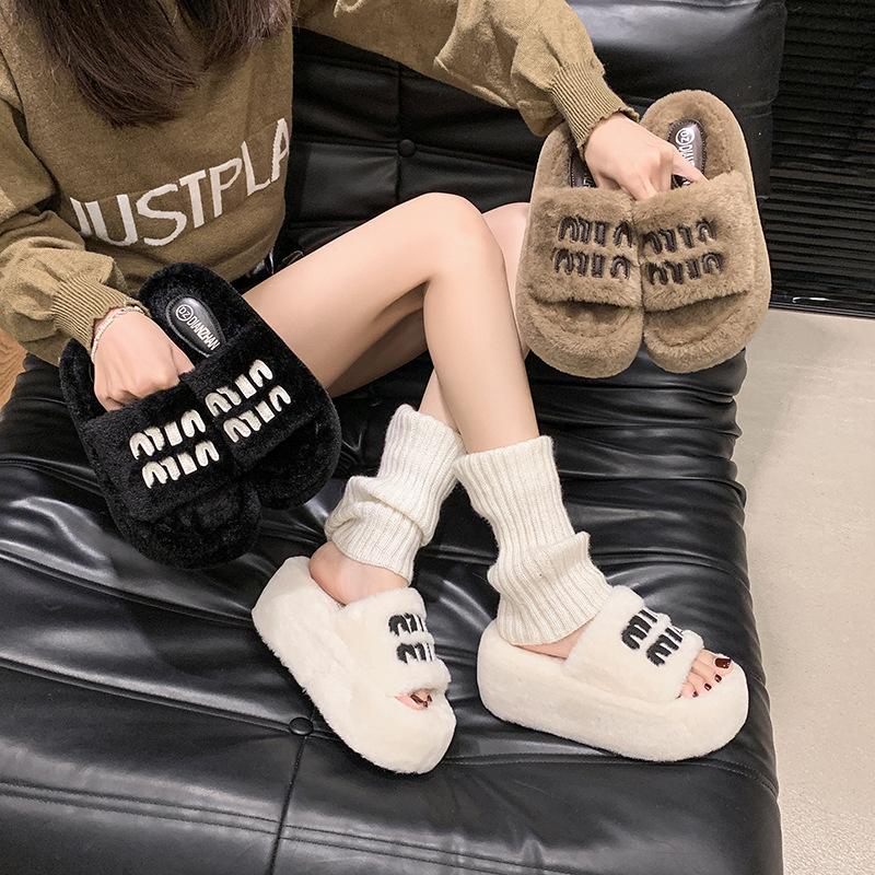 Thick-soled Fluffy Slippers Women's Outer Wear 2025 New Autumn and Winter Casual Fashion Plush Letter One-word Cotton Slippers