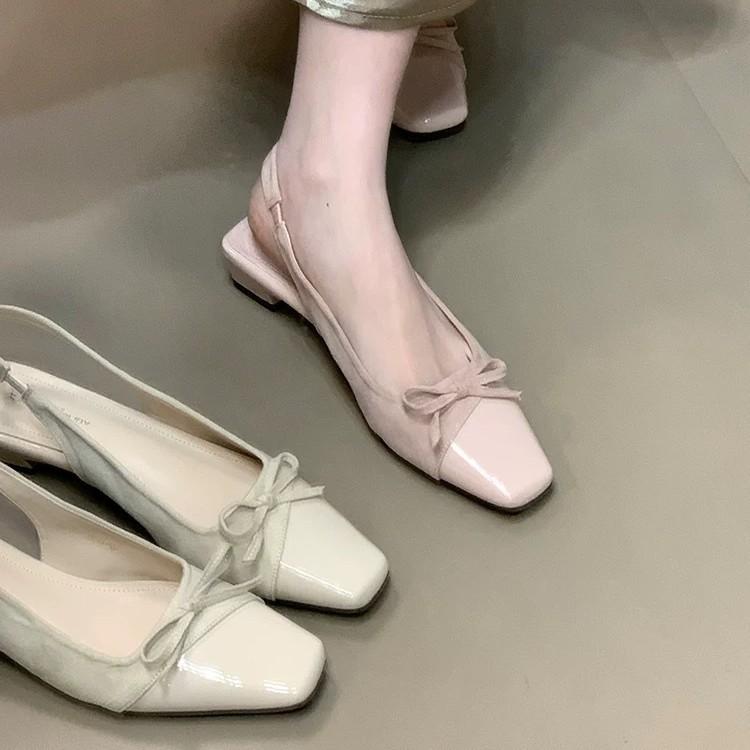 Fairy Wind Gentle Niche Bow Splicing Women's Shoes Heel Sandals with Skirt Bag Head Thick Empty Square Head Single Shoes Women