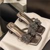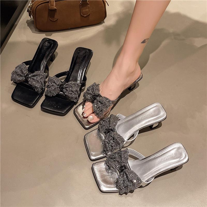 One-word Bow Open-toed High-heeled Rhinestone Fashion Fairy Wind Cool Slippers 2025 New Women's Summer Wear
