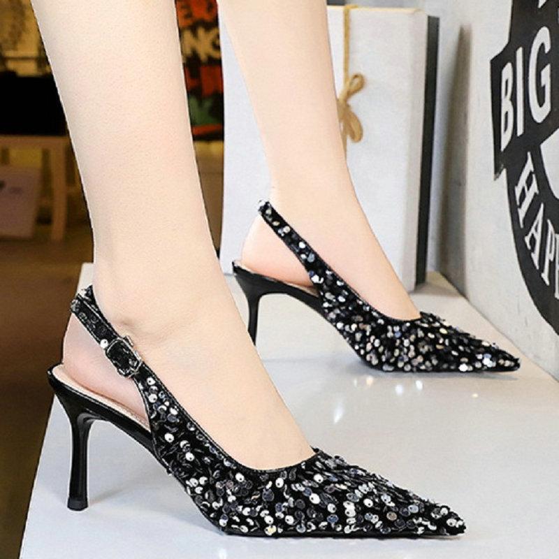 Euro-American Style Party High-Heeled Women'S Shoes With Empty Pointy Back Hollowed Out Back Strap Sequin Single Shoes