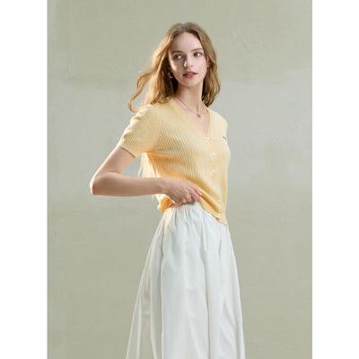 SanCai 2025 Autumn Lyocell Embroidered Slim Fit V-Neck Short Sleeve Knit Top