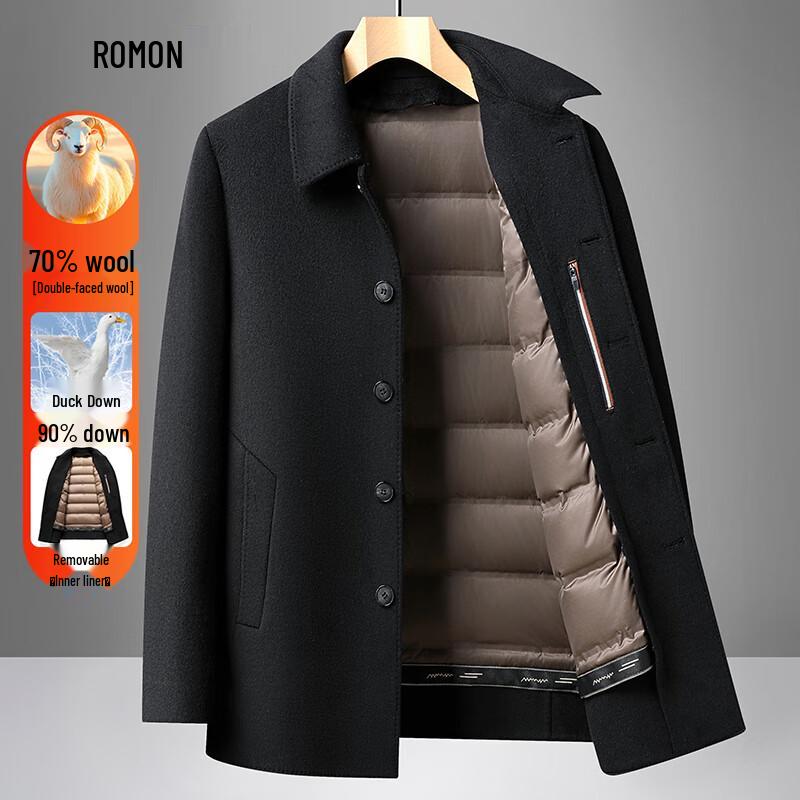 ROMON Men's Thickened Mid-Length Double-Sided Wool Coat with 90% Duck Down Liner