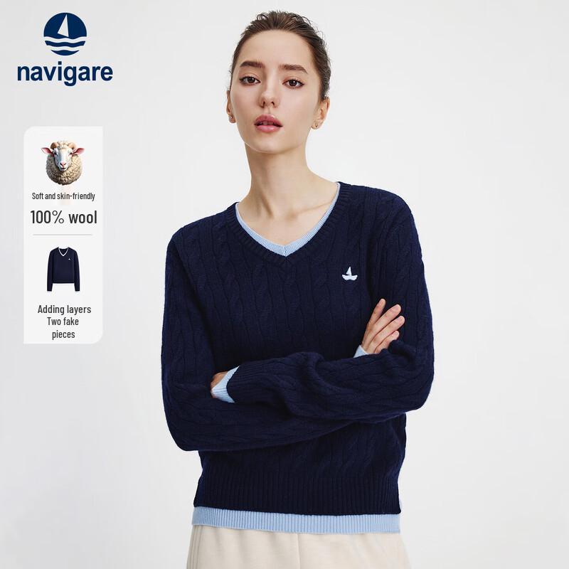 Navigare Women's V-Neck Faux Two-Piece 100% Wool Sweater