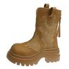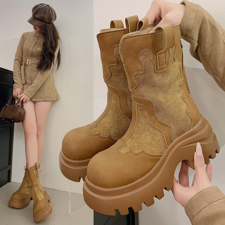 National Style 2025 Autumn New Single-layer Leather with Cloth Thick-soled Denim Fashion Explosion Martin Boots Children's Round Head Short Boots