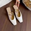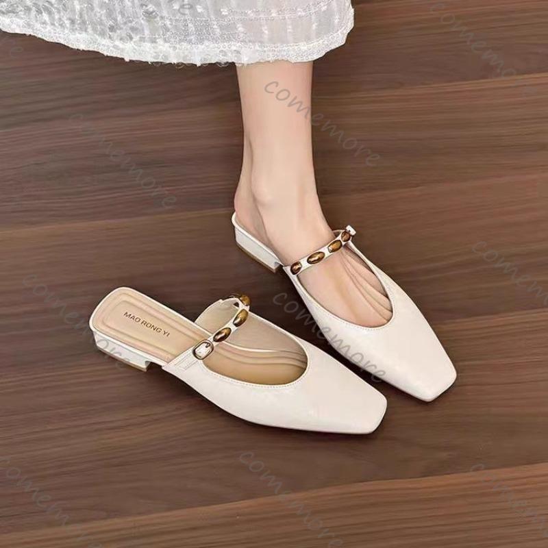 Comemore Square Head Slippers Satin Shallow Mouth Metal Buckle Slip On Women's Shoes Spring Summer Mules Baotou Half Slipper