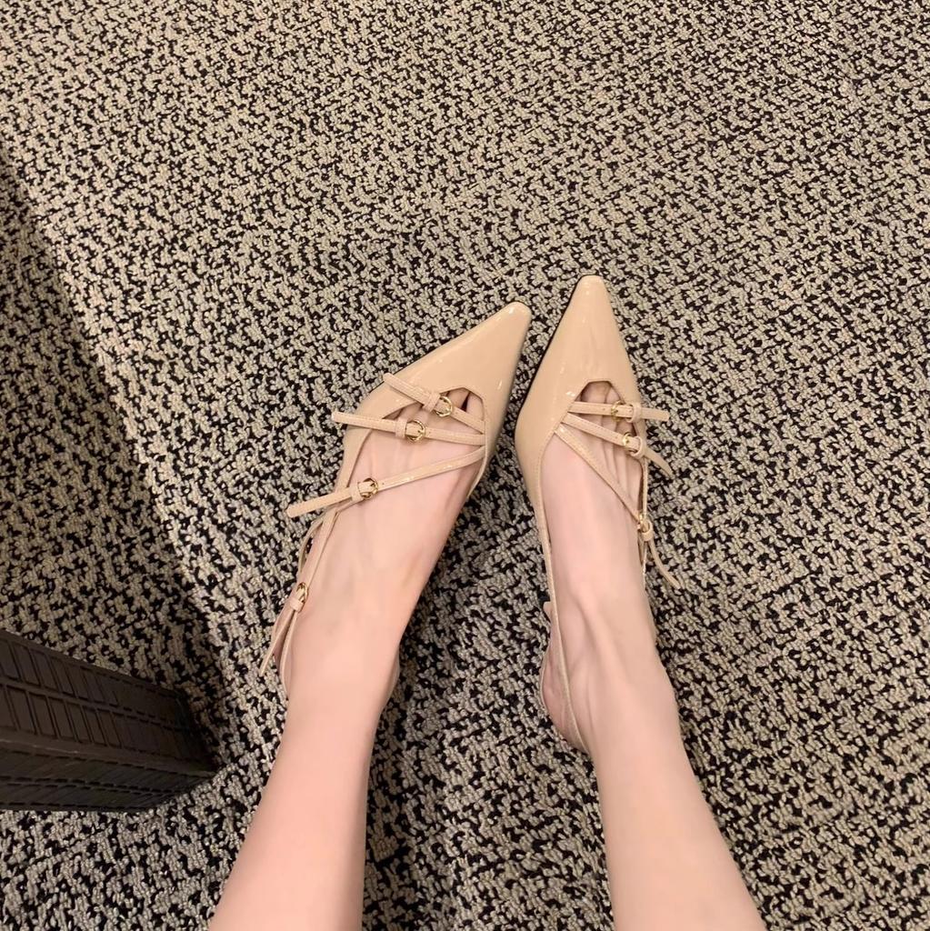 Sheepskin Version~ Genuine Leather One-word Buckle with Small Pointed Tip, Back Empty Stiletto High Heels, Women's High-heeled Sandals, Medium-h