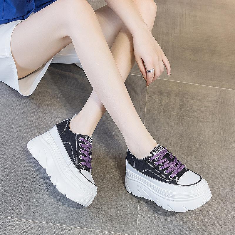 Casual Little White Shoes Women's 2025 Spring and Autumn New Thick Soles Increase by 9 Cm Canvas Lace-up Muffin Shoes Women's Board Shoes Tide