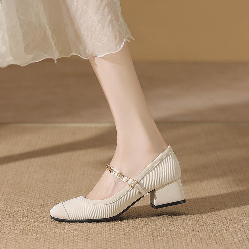 Square Head Thick Heel French Evening Breeze Single Shoes Women's Spring and Summer New One-word Buckle Belt Burgundy Mary Jane Shoes Women