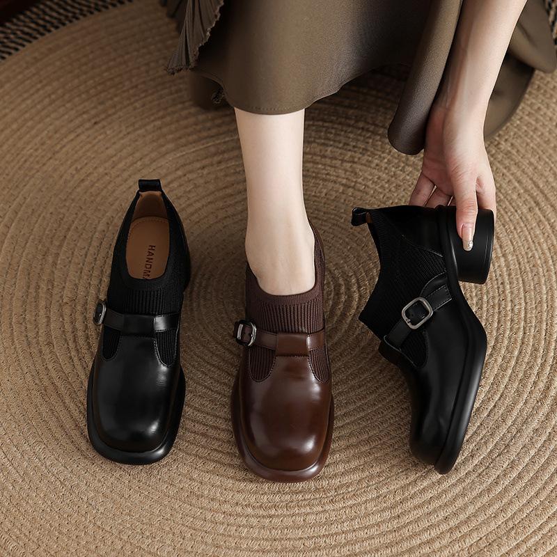 Large Size Flying Weaving Deep Mouth Single Shoes New Mary Jane Shoes Belt Buckle Thick Heel Small Leather Shoes