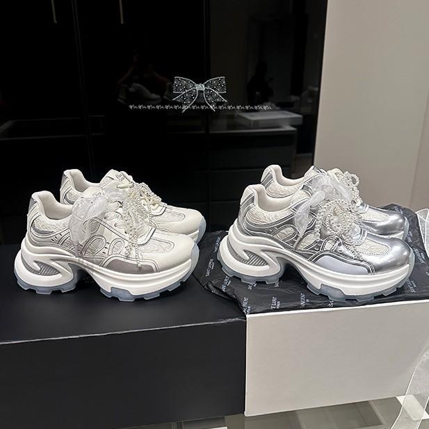Cowhide Version~ Inner Heightening Lace Pearl Dad Shoes Women's Breathable Leather Casual Sports Shoes Women's Platform Dad Shoes