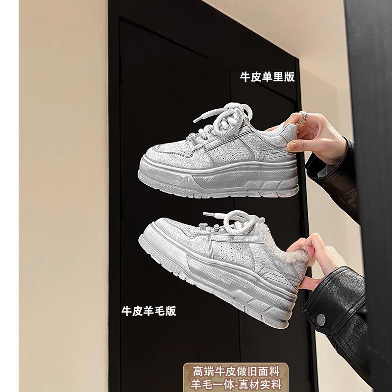 [Cracked Cowhide Version] Korean Version of Heightened Thick-soled White Shoes for Women's 2025 Winter New Velvet Warm Casual Board Shoes