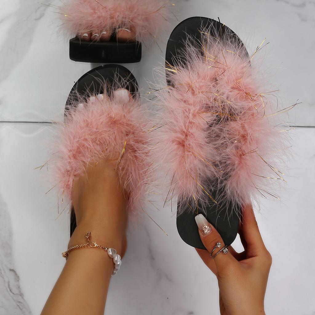 Fashion New Summer Faux Fur Platform Slippers Women Indoor Furry Fur Slides Women Plush Flat Sandals Casual Fluffy Slippers House Shoes