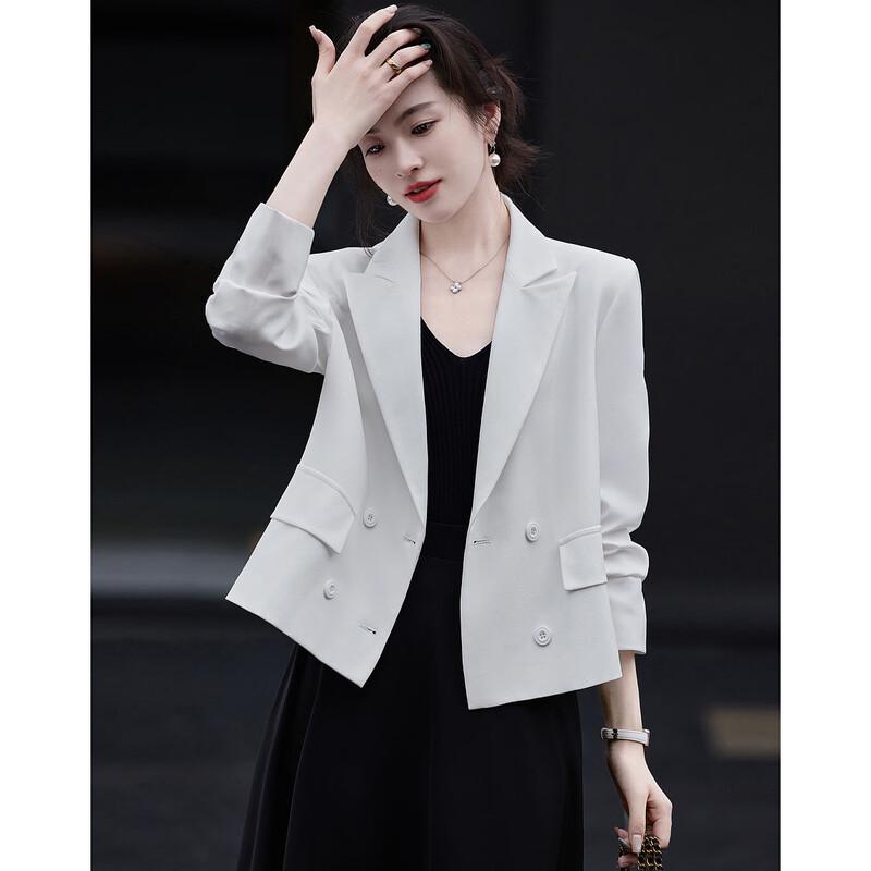 Demana CBD Chic Peaked Lapel Double-Breasted Short Blazer with Irregular Split
