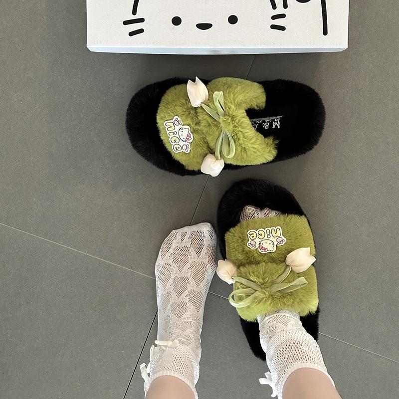Cute Cartoon Tulip One-word Fluffy Slippers Women's Wear Autumn and Winter Fashion Casual Platform Cotton Slippers Single Shoes
