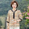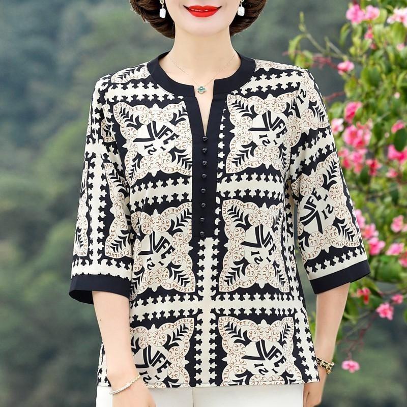Women's New Spliced Pullover Round Neck Button Printed Fashionable Loose Centre Sleeve Shirt