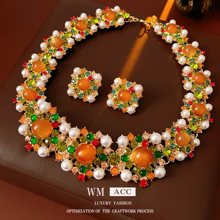 Medieval Vintage Diamond-encrusted Pearl Stud Earrings Necklace, Light Luxury Niche High-end Set, Retro Court Style Jewelry