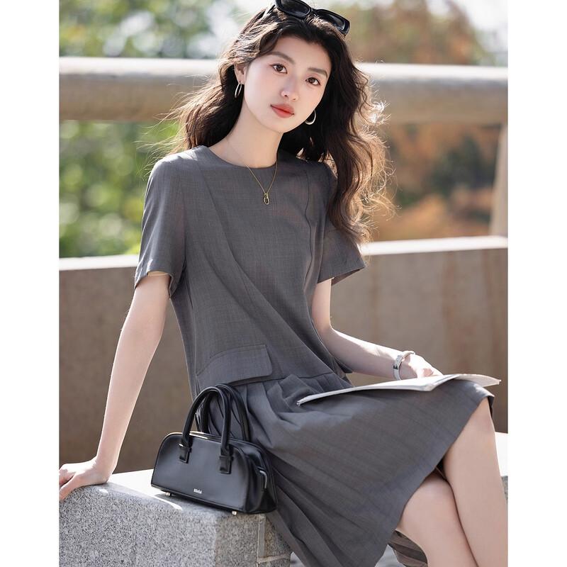 Demana Casual Style Women's Round Neck Pleated A-Line Midi Dress with Pockets