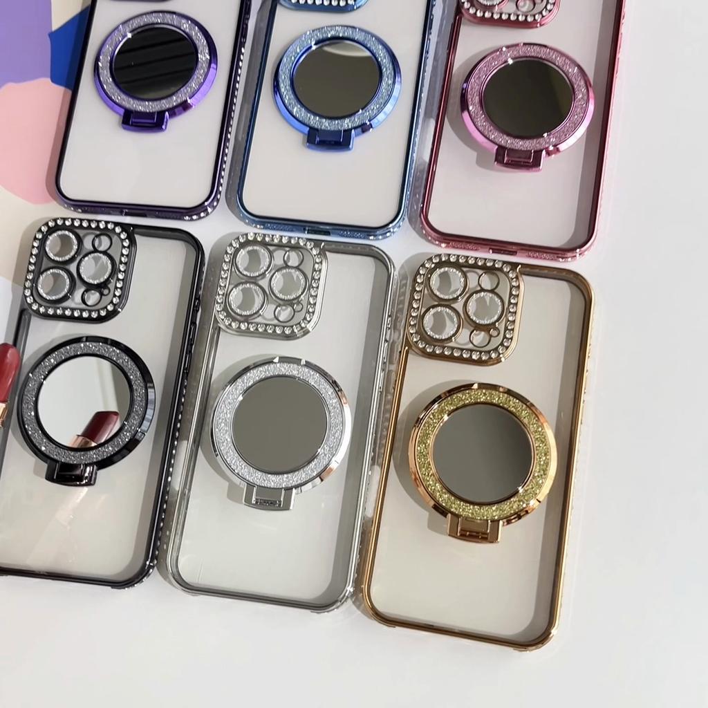 Girls Cute Glitter Diamond Makeup Mirror Camera Lens Protector Bumper Phone Case With Stand For iPhone 17 16 Pro Max Samsung S25 S24 Protective Cover