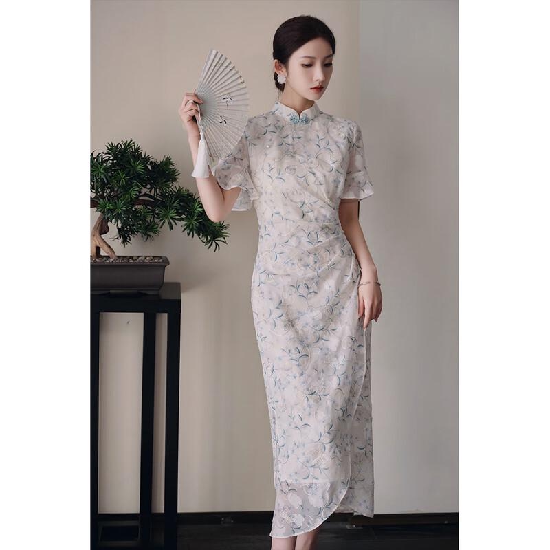 JK&JS New Chinese Style Chiffon Floral Slim Cheongsam Dress