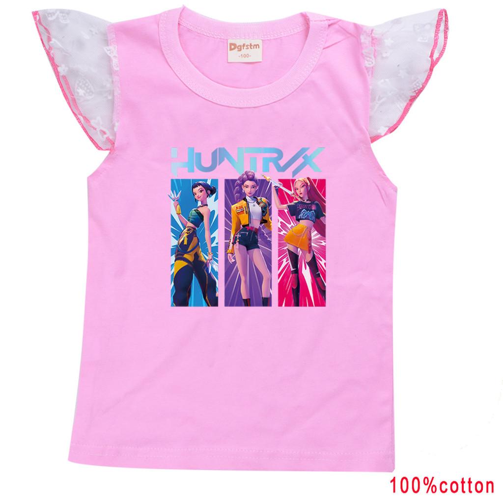 Kids Girls Anime Cartoon K-Pop Rumi Singer Super Star Print Mesh Short Sleeves Cotton T-Shirt