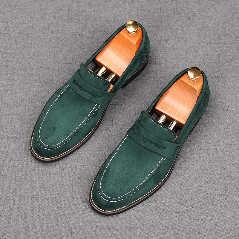 New Men's Pointed Slip On Suede Leather Business Flats Shoes Male Designer Penny Loafers Homecoming Wedding Dress Footwear