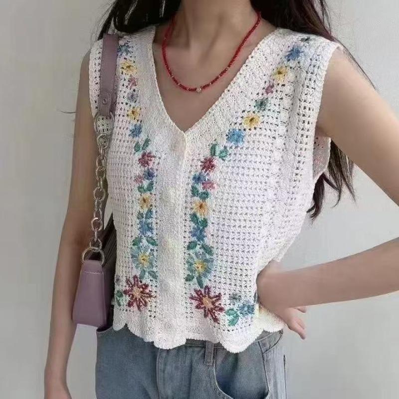 Floral Embroidery Women's Vest Hollow Crochet Sleeveless Ladies Knitted Sweater Stacking Woman Autumn Trendy Casual Tops