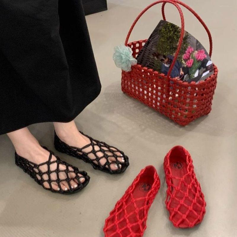 French Woven Mesh Hollow Low Heel Round Head New Sandals Fashion Pig Cage Shoes Red Breathable Hole Shoes Women's Shoes