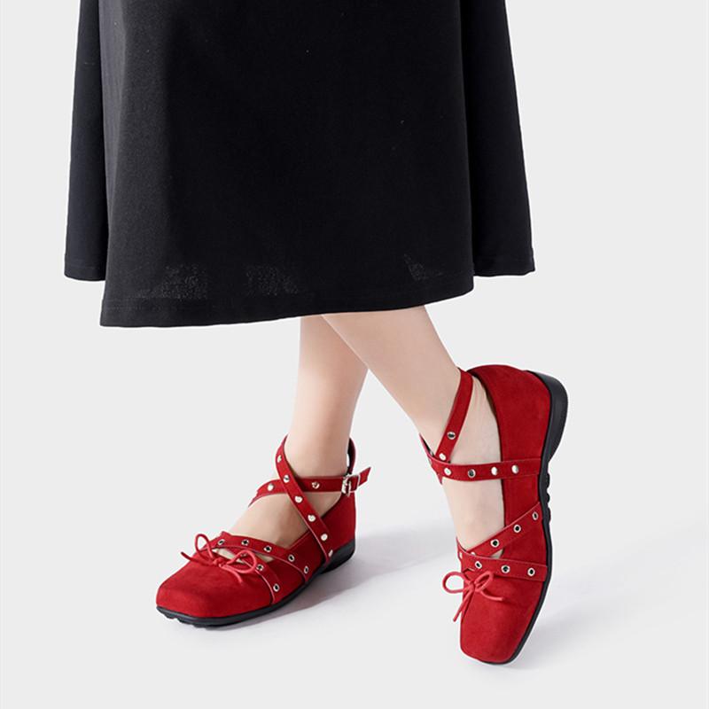 Spring Autumn Rivet Strap Buckle Faux Suede Bowknot Women Ballet Flats Mary Janes Walking Loafers Casual Girls Shoes