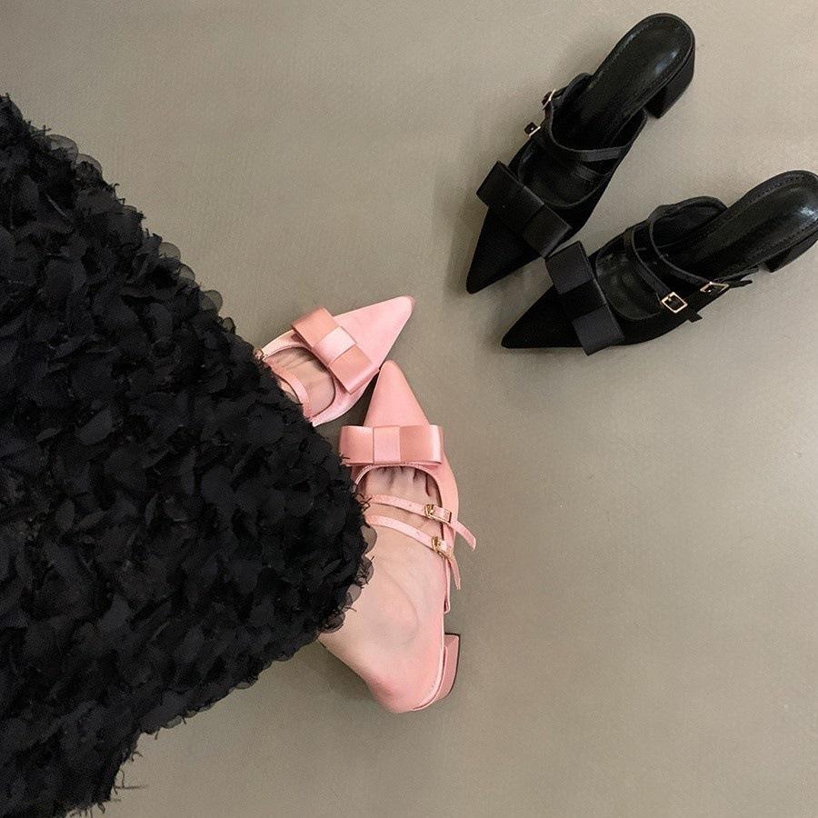 Pointed Toe Sandals Bow New French Thick Heel Bag Head Half Slippers Women's Shoes 2025 Summer Mary Jane Outer Wear