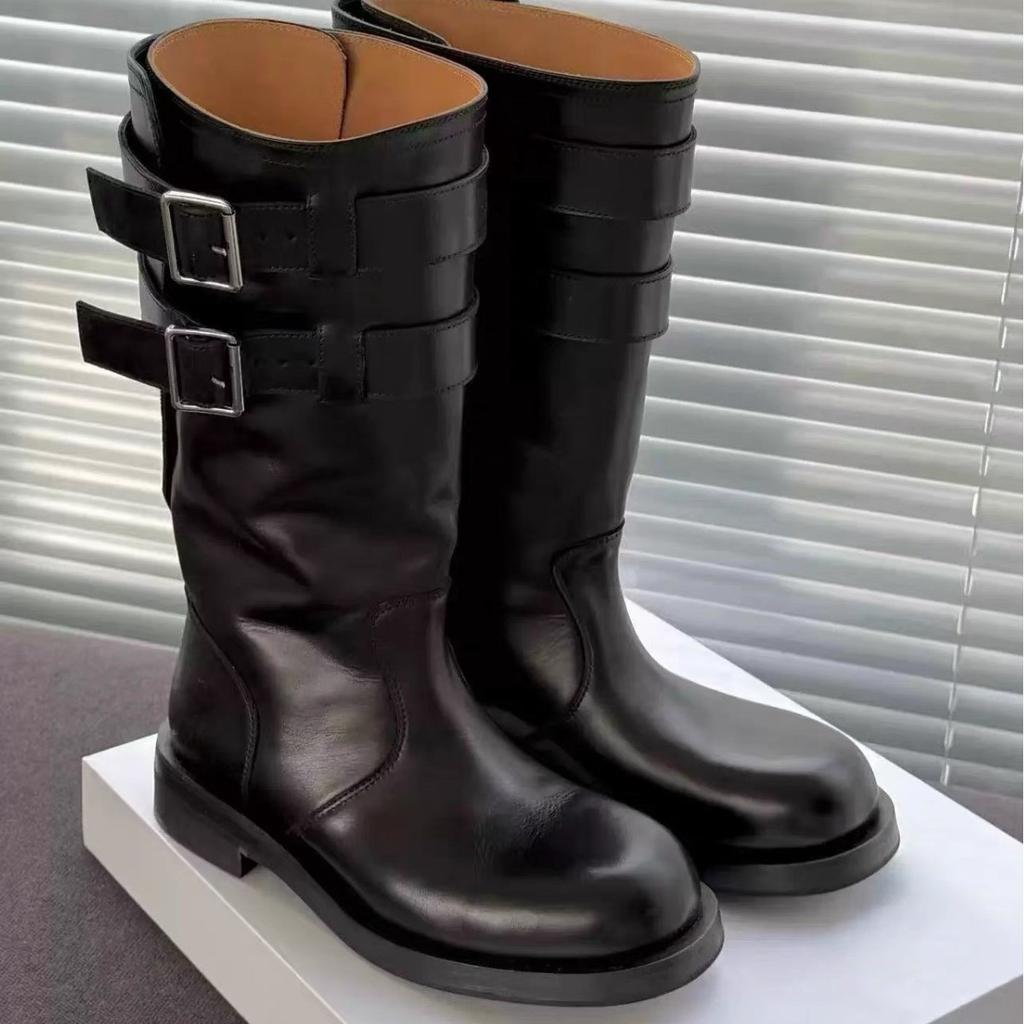 Cowhide Version~ Korean Version of High-end Sleeve Belt Buckle Knight Boots 25 Years Old New Round Head Leather Temperament Locomotive Boots