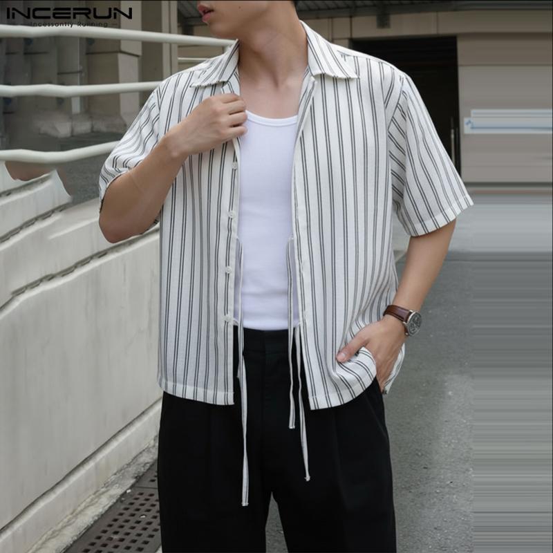 INCERUN Men Lapel Neck Short Sleeve Bow Knot Striped Casual Shirts Tops