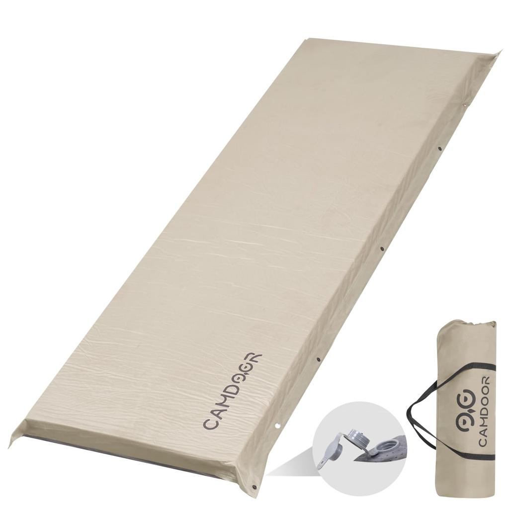 [Unparalleled Durability] The air mattress's front is made of 210T composite PVC and high-resilience sponge material. It offers high-strength waterproofing, so even if it gets dirty, it can be wiped clean with a towel. The ergonomically designed camping mat promotes deep sleep, maintains the body's natural shape, is soft to the touch, and has high resilience. There's no contact with the ground! You'll get a good night's sleep. The back of this self-inflating sleeping pad is non-slip, making it suitable for any occasion. The back of the air mattress is made of polyester, a material that is tear-resistant even when cut forcefully by thick branches.