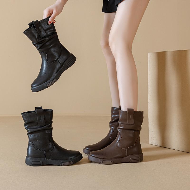2025 Autumn and Winter New Leather Medium Boots Women's Martin Boots Versatile Thin Boots European and American Retro Knight Boots